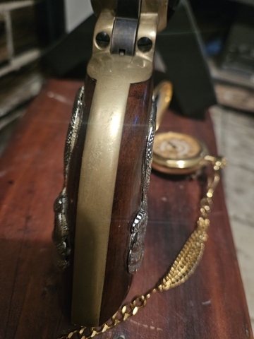 Pistol is a ASM Blackpowder 44 caliber revolver that someone modified and put some rattlesnake grips on. The snake emblems don't match up if you look st it from the back (see photos) but you can't really notice it. I've had it hung up next to this poster. I acquired the pistol to put next to the poster and never shot it.