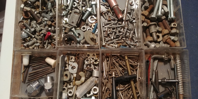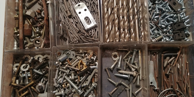A used Akro-Mils organizer with some random bits of nuts, bolts, screws hardware.