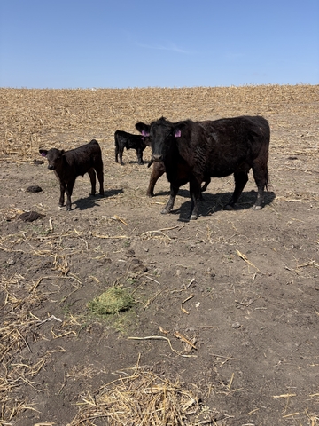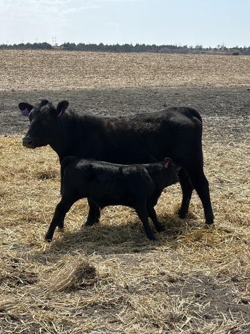 45 1st calf pairs the kind you want! All calved on their own with no assistance. 29/45 AI sired calves by True North or Counter Threat. Started calving February 12 have 2 left to calve as of April 3rd. Hot wire broke calved on corn stalks and maintaining very well on stalks no supplement. I will start supplementing feed in the next week. Will have all the calves processed and bulls cut. Cows will be poured. Willing to deliver within a couple hours. Check out the video and photos!! Call or text me 785-5three4-0481