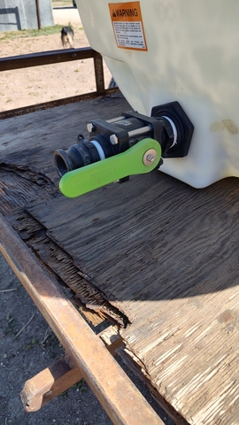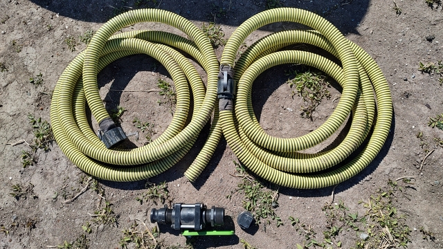 1.5" hoses. Have extra valve for the tank. Also has a gate for the trailer if wanting to take wanter tank off to haul something else.