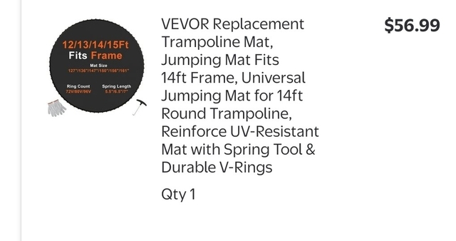 14' Trampoline Mat. Brand new in box. We purchased the wrong size and unable to send back.