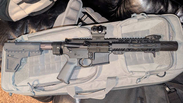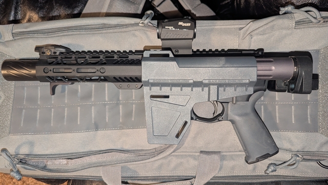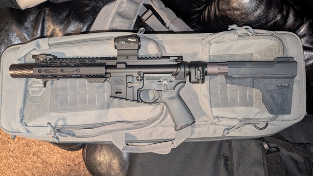 PSA 8" upper and PSA lower. Shockwave pistol brace. Sylvan Arms folding adapter. (Works well, but there is a little wiggle in lock-up).