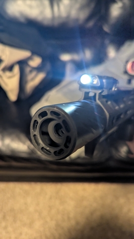 Muzzle device is a really nice forward blast compensator (don't remember brand) and tames the concussion down on this thing.