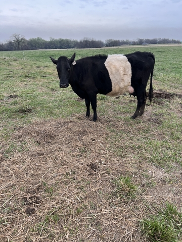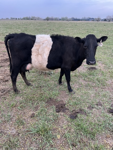 4 year old Dutch Belted cow. She is a smaller cow. Closer to the size of a jersey. DOB 3/29/2022. She is being milked and had her 3rd calf on 3/29. Would make a good family milker with her smaller size and gentle disposition.