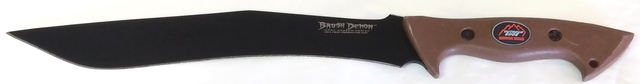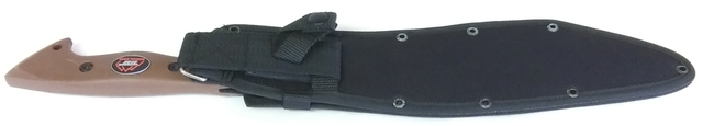Used survival fixed blade knife, w/ sheath. 2014 first production run. Overall length: 20". Blade length: 13". Clean. Tested good. Knife itself good condition. Sheath like new condition.