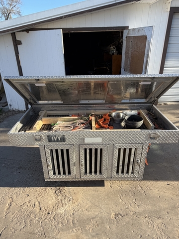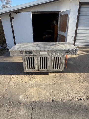 Three hole dog box 31deep by 15 wide by 20 tall with top Storage. Solid aluminum. Have a trailer and no longer need! $850