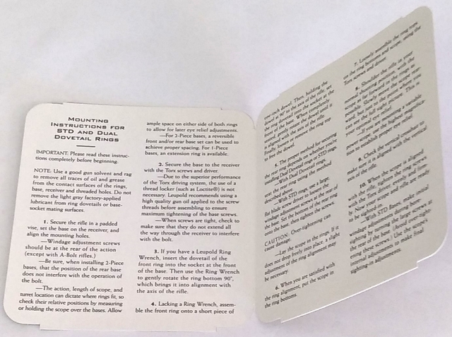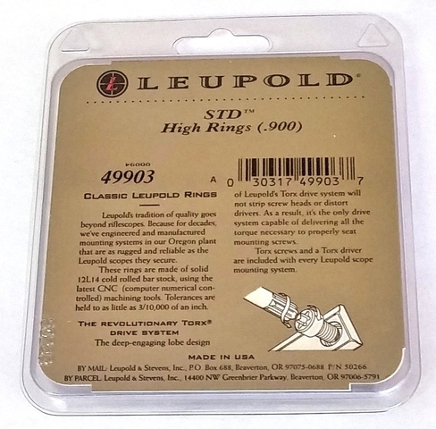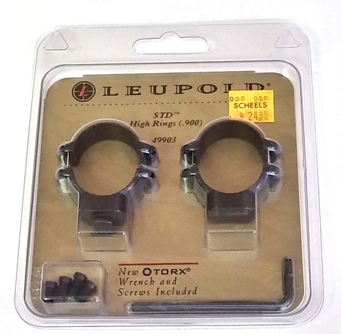 High steel standard (STD) riflescope rings. Ring diameter: 1". Ring height: 0.9". Ring model fits riflescope w/ 1" maintube. Meant to be paired w/ Leupold Standard bases. Perfect choice for calibers < .300 Win. Mag. Torx wrench does not work w/ included torx screws. However, included torx screws are proper size for rings. All clean. Other than possible faint cosmetic wear on ring bottoms, used - like new.
