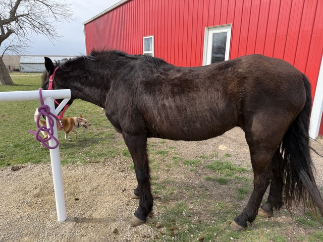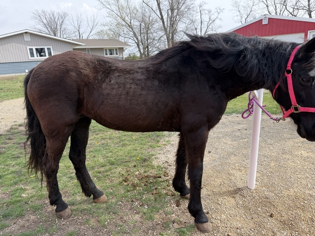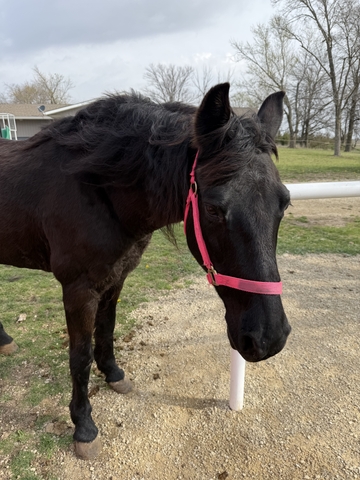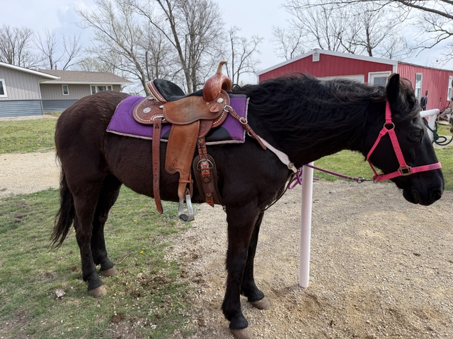 Midnight is a 20+ year old black mare. Bought her out of an auction last year so don’t know much about her history. She is gaited! Absolutely NO buck, rear, bite, kick or anything like that. Not spooky. Have trail rode her mostly and she prefers to walk (will trot or lope if asked) but she walks very fast. A little too intimidating for my 8 year old daughter. She plow reins but has a good stop and listens well. She enjoys going out with other horses and for her age can keep right up or out walk the others. She ties like a champ and never pulls back, jumps right in a trailer, bathes, etc.