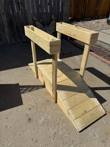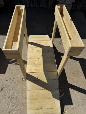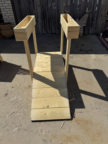 Reclaimed wood garden bridge. Bridge is 66 inches long and 18 inches wide. Top planter boxes are 2ft long X 4in X 4in