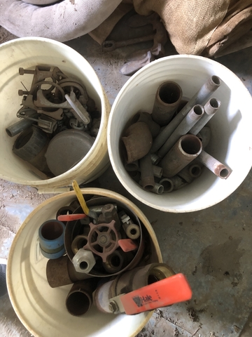 Buckets of pipe fittings and valves some are new