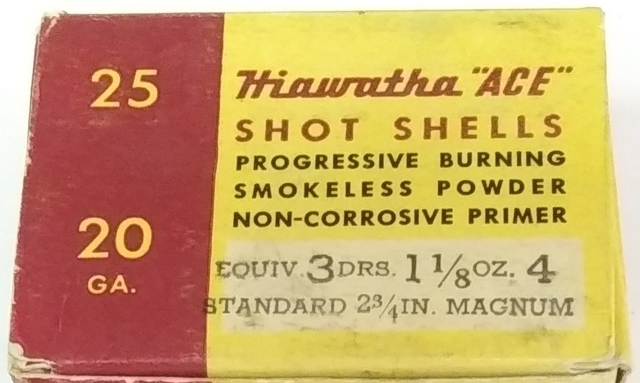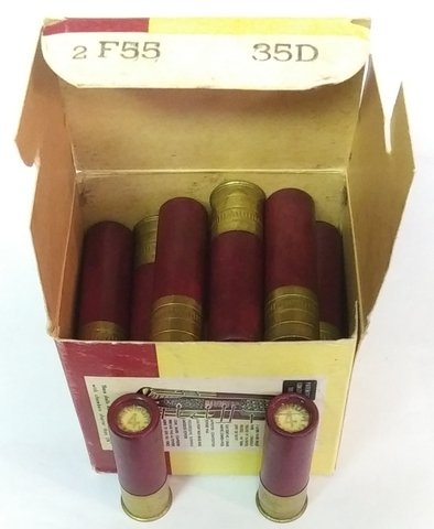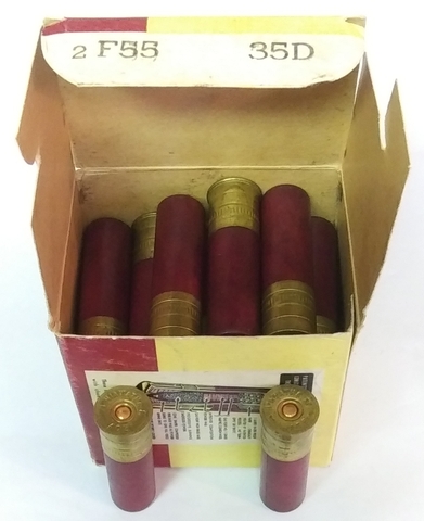 25 paper shotshells. Lot No. 2 F55 35D. $0.64 / shotshell. Shotshells new, but in opened box. 5 shotshells have crack in overshot wad. Box fair condition. Unknown how ammo has always been stored, or how old it is. Sold as collectible ammunition. Clean.