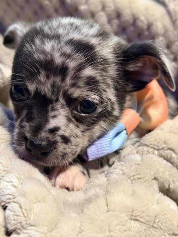 • Rare Beauty: Featuring a stunning Blue Merle Tri-color coat—a look so unique most people have never seen it on a Chihuahua.
