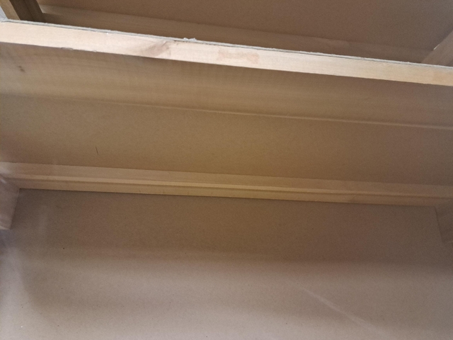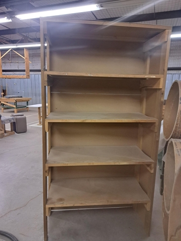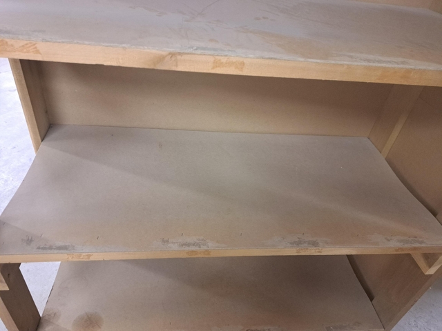 SHELVES ARE THICK CARDBOARD CHIPBOARD. ARE STURDY THOUGH WITH BRACES BENEATH
