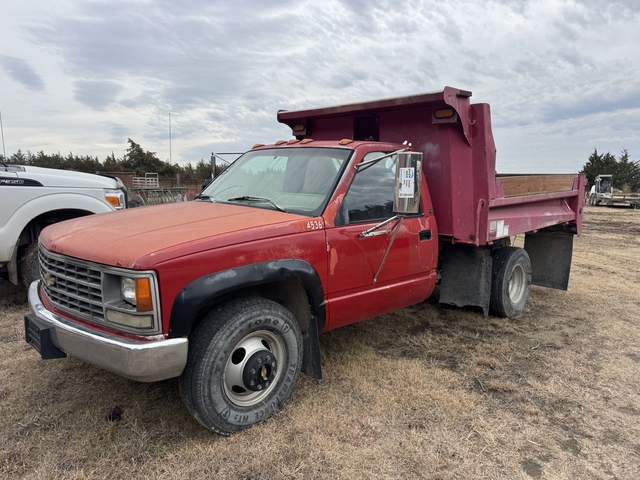 1990 Chevy 3500 2WD dump truck. Runs and drives straight with good tires, ready to go to work.