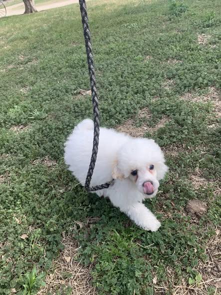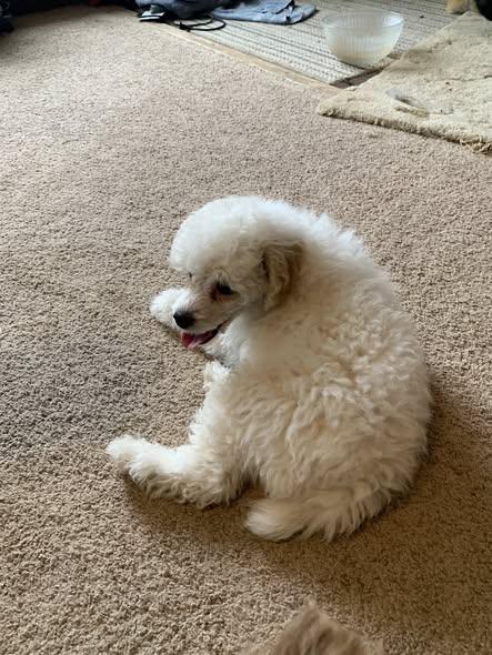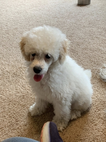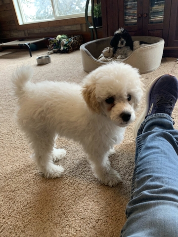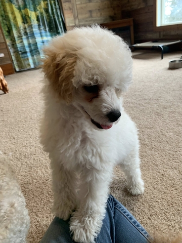Gus is a sweet, loving, playful little guy. He is a cream parti in color. He is all white with cream colored ears. Gus has been raised in our home and has been started on potty training.