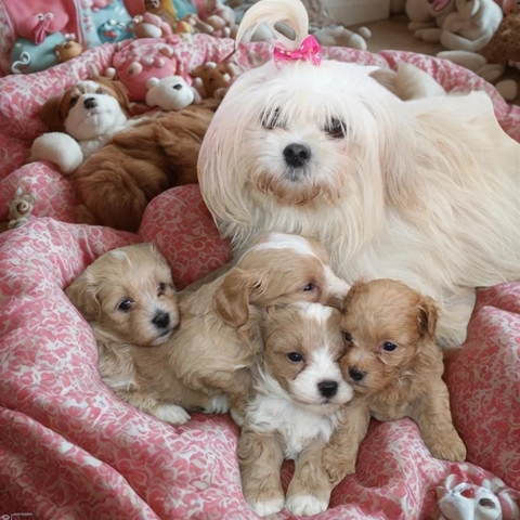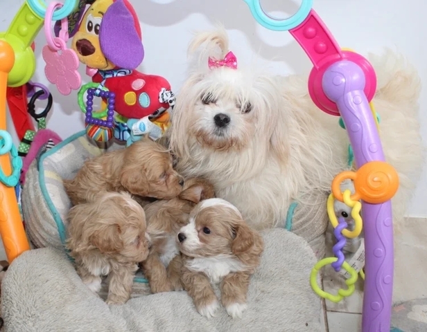 We are so excited to introduce our very exceptional Toy Maltipoo puppies, raised right in the heart of our home! Dad: handsome red AKC Registered Toy Poodle. He’s a total sweetheart and is 100% genetic health clear. With proof of dna test. Mom: Our stunning Maltese. She is very small, sweet , and has a full panel clear DNA health certificate. These babies are to die for, fluffy, and have the most incredible temperaments. Because they are raised inside our home, they are confident, well-socialized, and ready to be your new best friend
