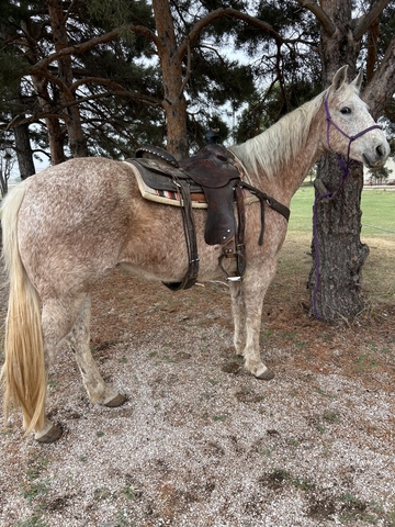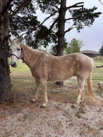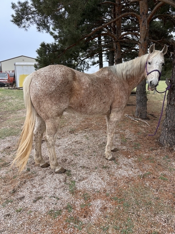 Hershey” 11yr old grade gelding Kid Safe and Beginner safe!!!! Stands at 15.2. Perfect horse for your kids to start learning off of or anyone starting to get into riding! Has been trail ridden all over the place, will go across water, anything standing in his way! Not only has he just trial ridden but he has plenty of ranching experience and rodeo, can be roped off of, sort cattle and drag calves!! 100% healthy and sound! Located in dodge city ks 213-321-2389