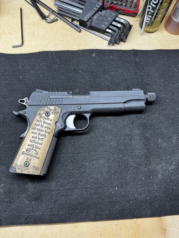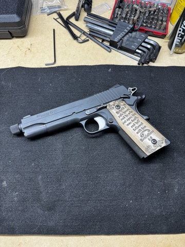 Sig 1911 in .45 ACP. Custom handle which can easily be changed. Threaded barrel. Comes with 4 clips. Open to offers. Text at six20-290-814zero