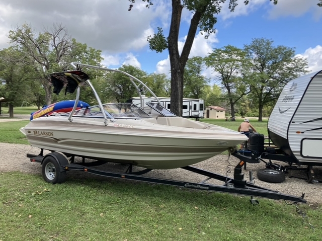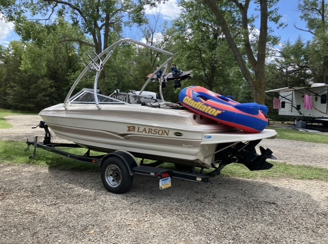 2001 Larson 190 LXi. 19’ long, swim platform adds a couple more feet. 9 passengers. Boat has always been shedded, is in excellent condition, and is ready for the lake. New: tower, tune-up, battery, prop, trailer wench, axle, tires. Wasn’t planning to sell so take advantage of a boat that needs nothing. (785) 639-6544