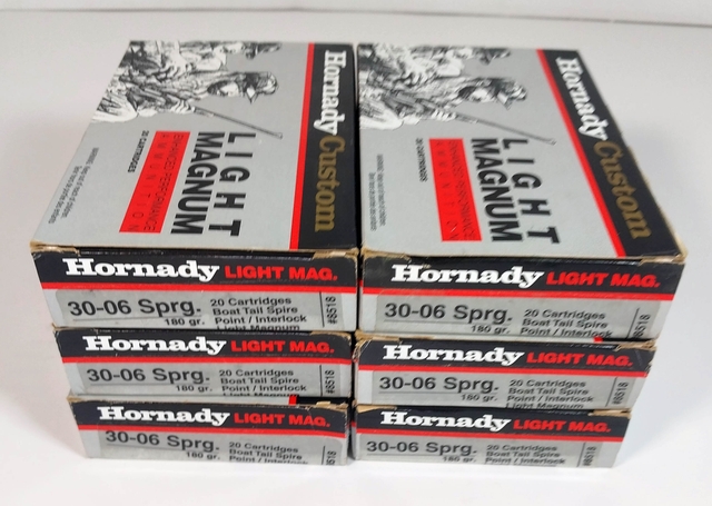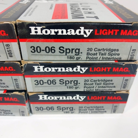 Hornady Light Mag Ammunition - 30-06 Springfield - 180 Grain Boat Tail Spire Point - 20 Rounds - Brass Case. All ammo has been stored in my ammo safe in air conditioned space. I have 6 boxes available 20 rounds each. $30 per box