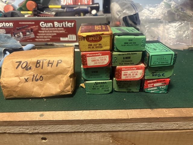 Variety of 6mm bullets (not loaded ammo), see photo for exact weight/style. 675+ total. Will meet in the Topeka/Shawnee County area.