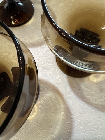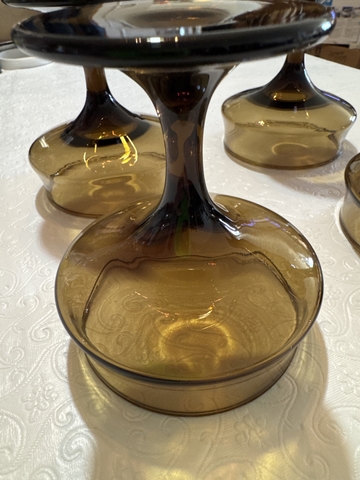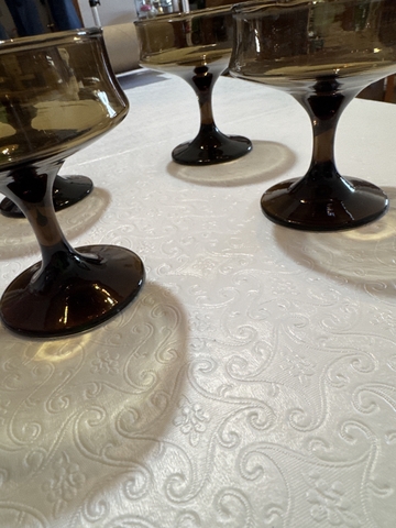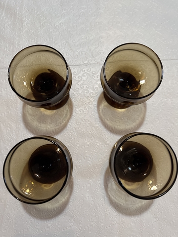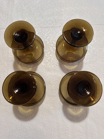These are really nice smoke brown champagne/ sherbert glasses. 4" tall holds 4 ounces. They are from the 1970's. No chips or cracks. There is a manufacturer bubble on rim of two glasses. See pics