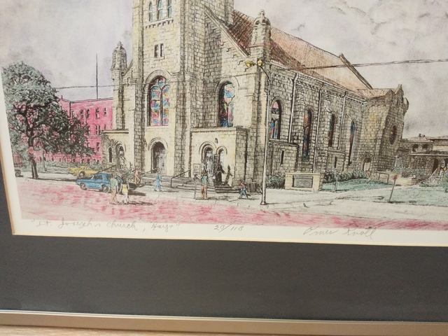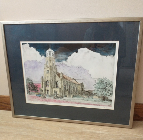 Framed, matted and signed Omer Knoll print "St. Joseph's Church" Hays KS