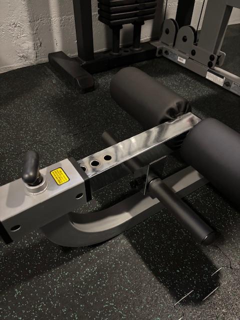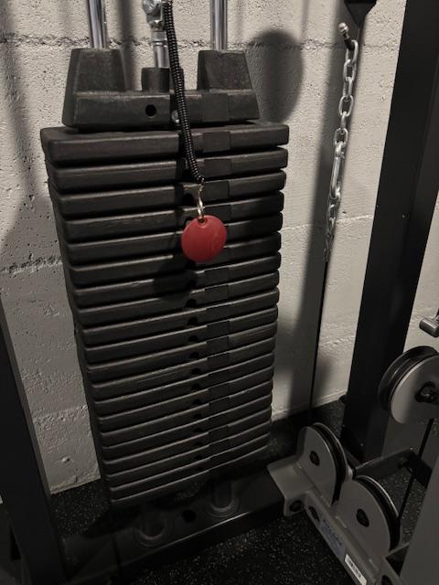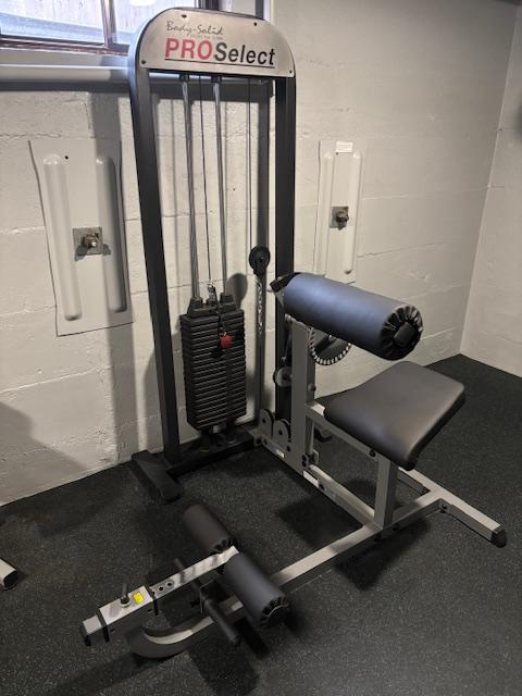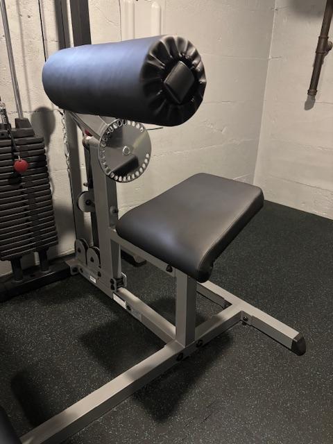 Body-Solid PRO Select ab/back machine. Bought it new, had it around 10 years, great condition. The overall footprint is 56" (longest points from the foot rest adjustment to seat support) x 51" (the weight stack to seat support) x 71" tall. There are 20 individual weights at 10lbs each = 200lb stack. There is a single pop-pin to select weight (red piece). Padded seat and padded chest/back bar.