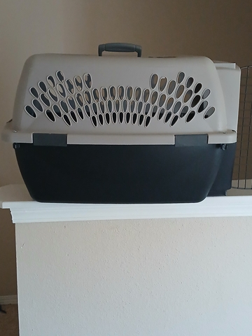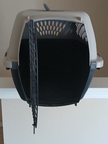 Hard sided black and grey pet carrier. For pets 15 to 25 pounds. 26.2 " L X 18.6 " W X 16.5 " H. In good condition.