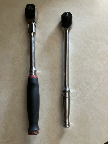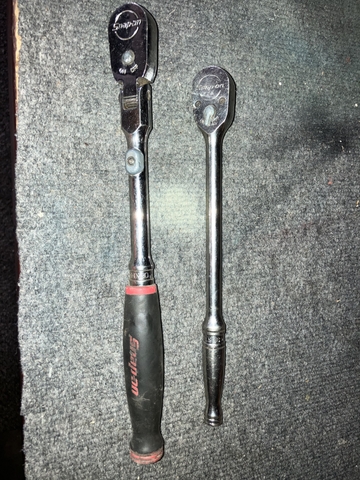 Left side photo: Snap-On Ratchet socket wrench. FHX80 US 6405621 Flexible Head Dual 80 technology soft grip flex-head ratchet with 3/8" drive.