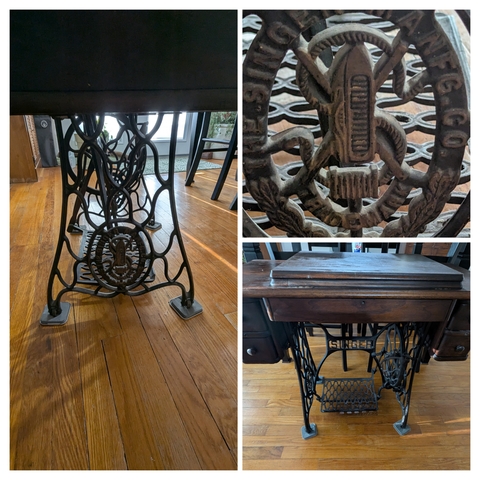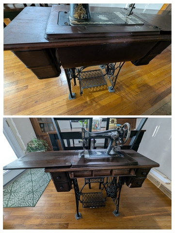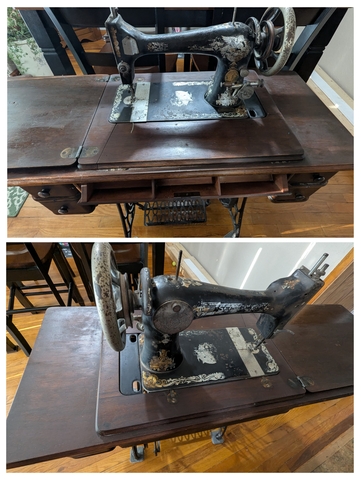 This is a 1900 Singer machine and cabinet. Still has a thread/bobbin, needle, and cable. Peddle moves freely. All drawers and fold down are intact. This is in excellent shape. Would make a great display or project to restore the machine.