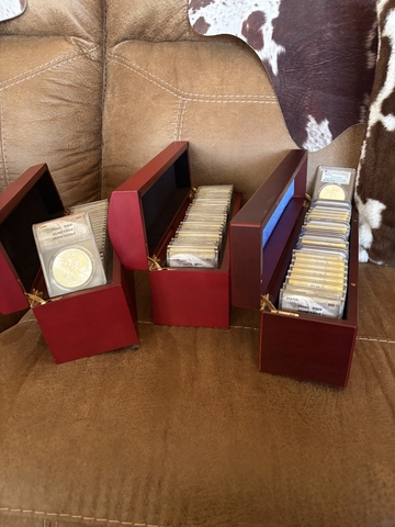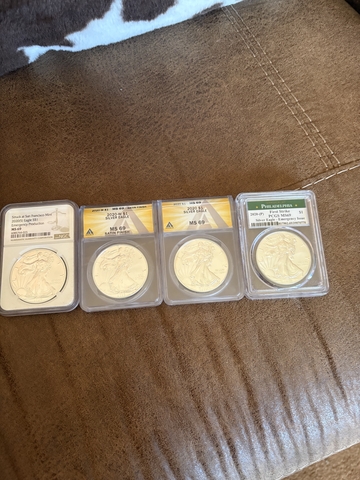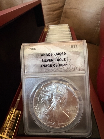 HAVE A SET OF SILVER EAGLES FROM 1986 TO 2025 MOST ARE GRADE MS68, MS69 AND SOME MS70 GRADED BY ANACS. THERE OR 74 COINS MINT P,S,W WILL SEND LIST OF EACH COIN IF INTERESTED