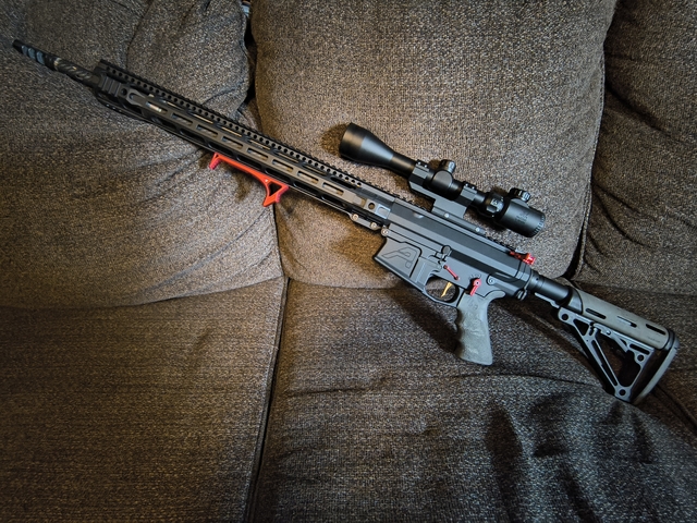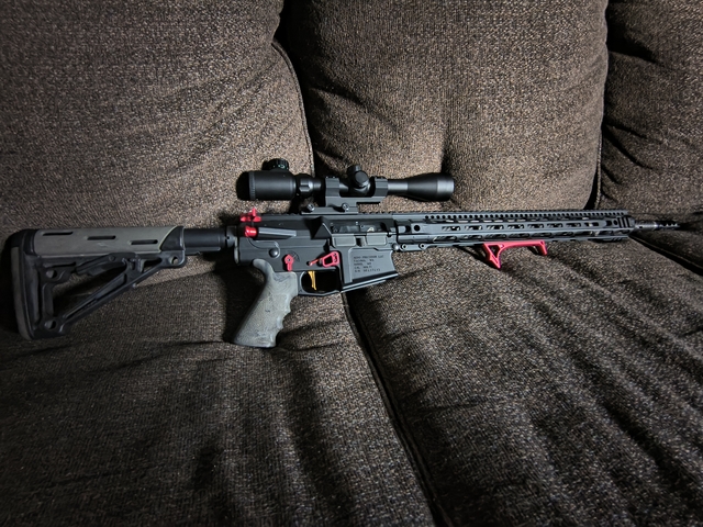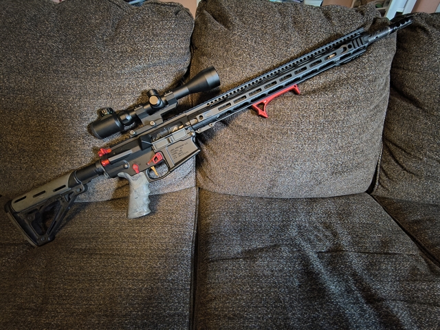 This is my custom 6.5 Creedmoor AR I built and am sad to be getting rid of. We are planning a move to a state here only straight wall cartridges are legal for hunting so selling this to get money to build an AR that is compliant with those laws. This AR has less than 100 rounds through it. Upper, lower, and BCG are all Aero Precision. I can't remember what brand the hand guard is. The stock and hand grip are both Hogue. It has an ATC trigger. The barrel is a BSF and is stainless/carbon fiber. Will come with several magazines (have to double check what I have). Has an NC Star 3-9x40 scope on a raised mount.