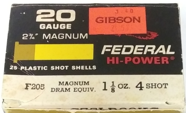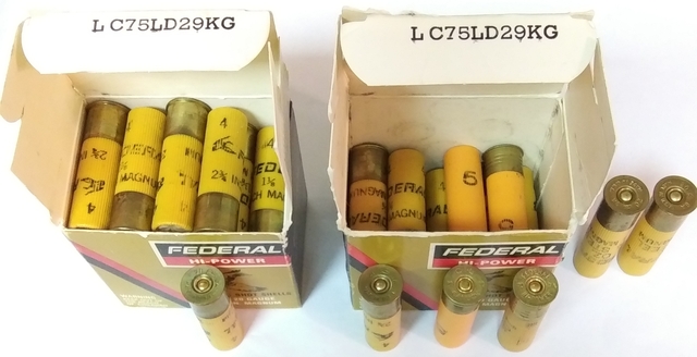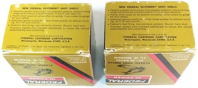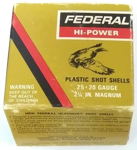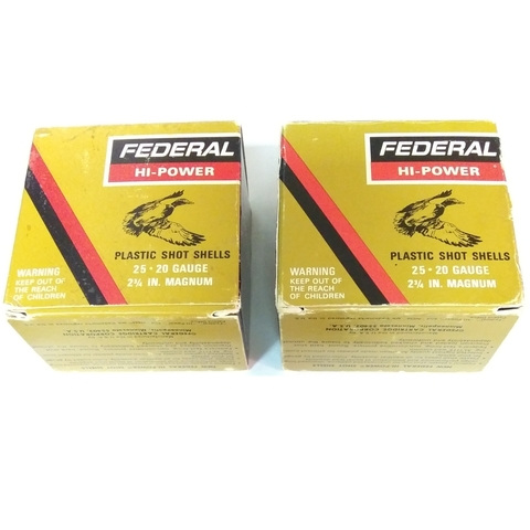 1 box of 25 shotshells. 1 box of 13 shotshells in 25-shotshell box. Lot No. LC75LD29KG. Comes w/ 3 C-I-L Canuck 20 GA, 5 shot size, shotshells. Measured length: 2.3125". Measured weight: 36 g. In box w/ 13-count. Comes w/ 1 Federal Hi-Power 20 GA, 1 oz. shot weight, 6 shot size, shotshell. Measured length: 2.25". In box w/ 13-count. Comes w/ 2 Federal 3" Magnum Steel 20 GA, 1 oz. shot weight, 4 shot size, shotshells. 44 plastic shotshells total. $0.68 / shotshell. Shotshells new, but in opened boxes. Boxes fair condition. Unknown how all ammo have always been stored, or how old it is. Sold as collectible ammunition. All clean. List price total for all items.
