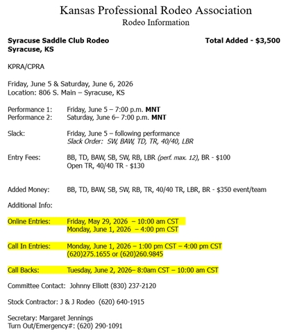 Online entries open May 29 (10:00 AM CST) https://kansasprorodeo.com/schedule%2Fdraw%2Fresults
