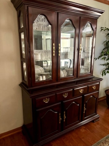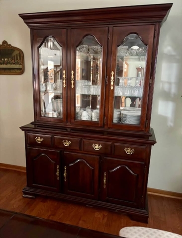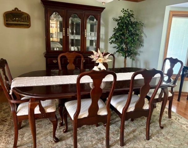 🪑 Details: - Table dimensions: • 85” L x 41.5” W x 30” H (with both leaves) • 61” L (without leaves) - Includes padded tabletop cover - China cabinet dimensions: 54” x 33” x 19” - Includes 6 chairs (1 chair has minor scratches)