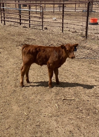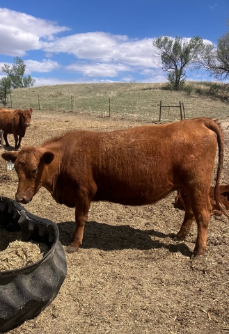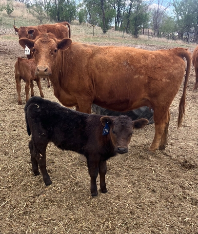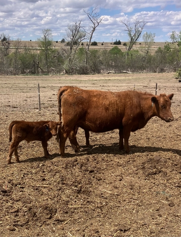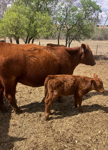 10 red heifer pairs with red and black March born calves. Calves vaccinated with Bovishield Gold 5, Untrachoice 7, bulls banded. Heifers and calves poured.