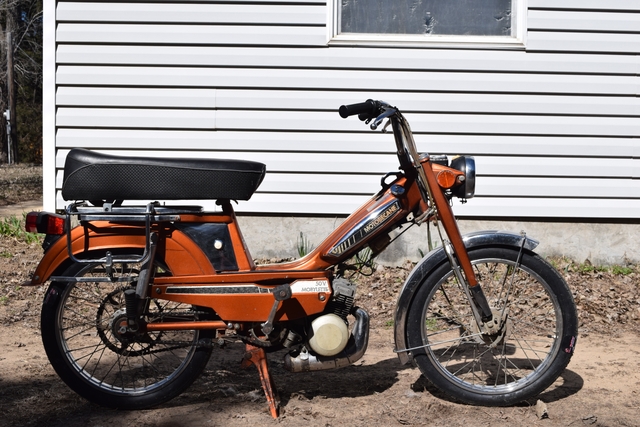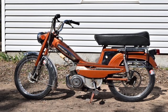 1979 Mobylette Motobecane 50V, 50cc 2 stroke tagged, street legal and titled in my name. The bike is pedal start, and can be disengaged from the engine to be rode as a bike. It runs, but wont idle. Has a small fuel leak from carb. Has new tubes and tires, fuel tap, grips fuel line and speedo cable. Worried about having to fix it? No worries it comes with the factory repair manual and parts diagram book.