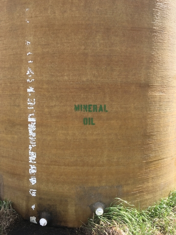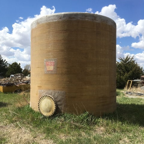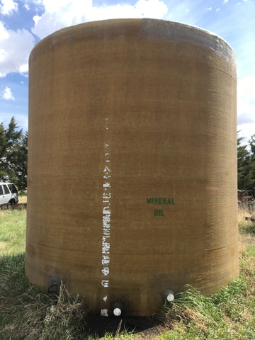 10,000 gallon fiberglass liquid storage tank made by Palmer manufacturing. Approx. dimension is 12'h x 12'dia.. Has had mineral oil only stored in it since new. One manhole opening, two bottom threaded outlets and one top vent opening. Has lift hooks top and bottom. 785-443-3348 Cash only.