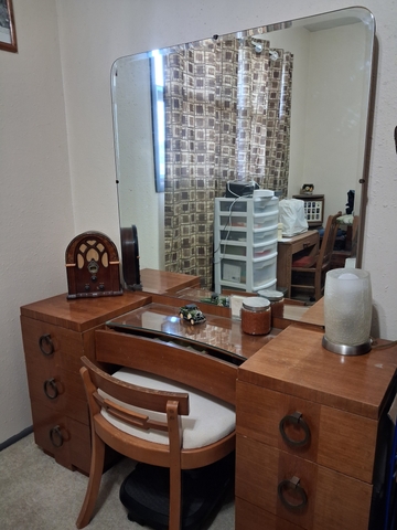 Solid wood. Has a couple drink rings on top but otherwise in great shape. Its been in spare bedroom but needing the space. You haul! Obo