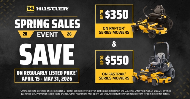 From April 15th through May 31st, save up to $350 off the Raptor® series and up to $550 off the FasTrak® series zero-turn mowers at participating Hustler dealers.*