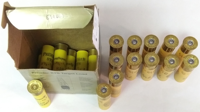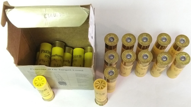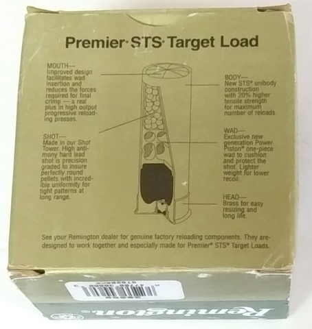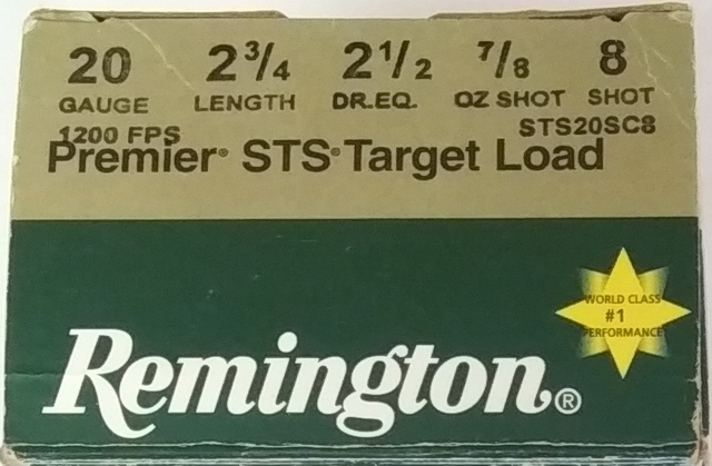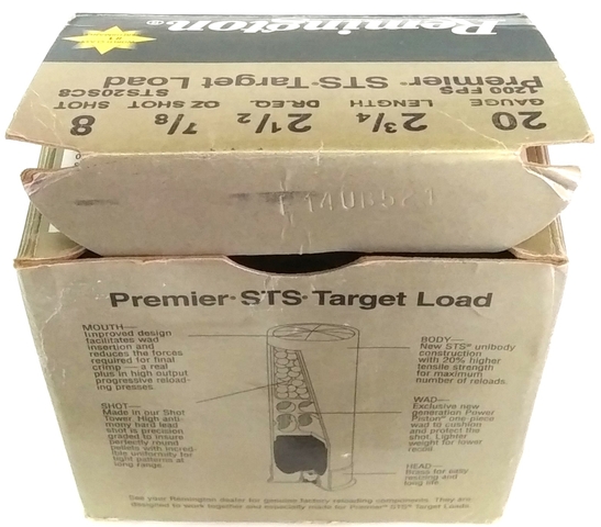 8 Remington shotshells in 25-shotshell box. Model #: STS20SC8. Lot No. E14UB521. Comes w/ 12 Estate Cartridge 20 GA, 0.875" oz. shot weight, 7.5 shot size, shotshells. Measured length: 2.19". In Remington box. 20 plastic shotshells total. $0.25 / shotshell. Shotshells new, but in opened box. Box good condition. Unknown how all ammo have always been stored, or how old it is. All clean. List price total for all items.