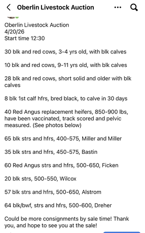 We have cattle sales in Oberlin, KS each Monday starting at 12:30. Pictured is a list of our consignments for Monday April 20th. You can also find a complete consignment listing on our Facebook page. For questions or consignments call (785) 475-8203.