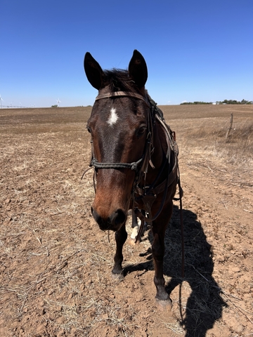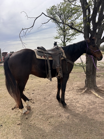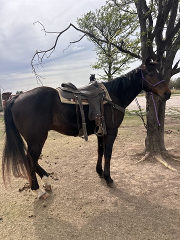 "Otis” 10yr old grade bay gelding standing at 15.2, Kid safe and beginner safe!!!! Perfect horse for your kids to start learning and gaining confidence as well for beginners, has done plenty of trail riding will go across anything without a spook, no bad habits, no kick, buck spook or bite, he’s the first one to meet you at the gate and loves attention and his treats! Stands tied to get saddled, for farrier, loads and unloads, can be left for months without riding and is the same horse at all times, Located in dodge city ks. 213-321-2389