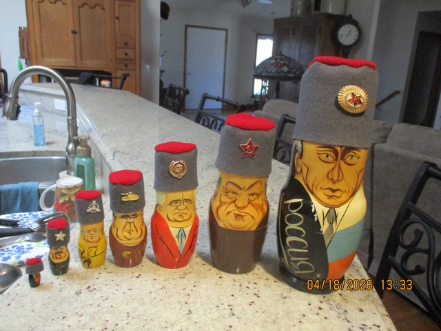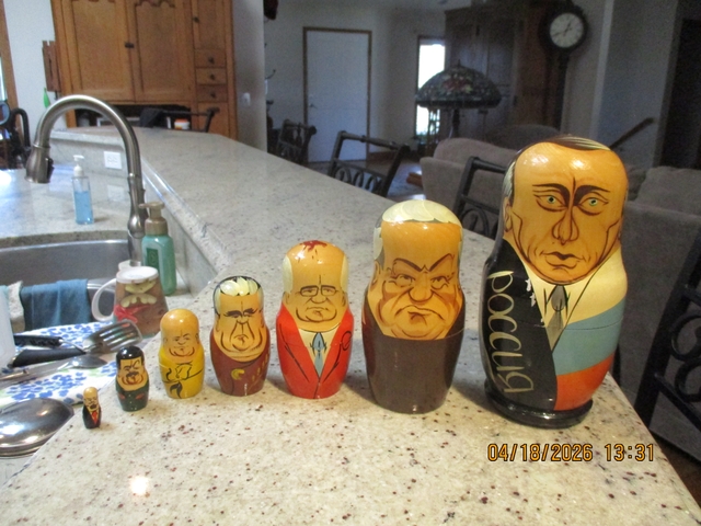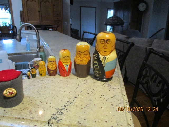 I have for sale Russia nesting dolls ( Rulers of Russia ) and I am asking 50 dollars for the set. I believe the rulers are Putin, Yeltsin, Gorbachev, Brezhnev, Khrushchev, Stalin and Lenin. Each ruler has a hat with a metal on each hat. If interested call 785-625-5110 or message me on nextech.