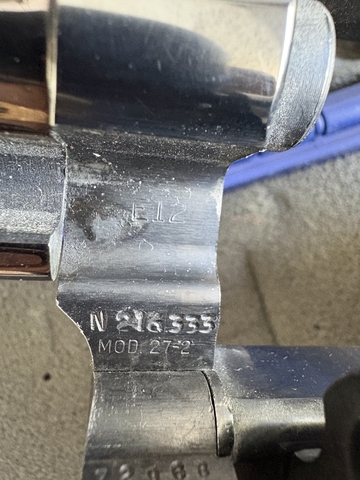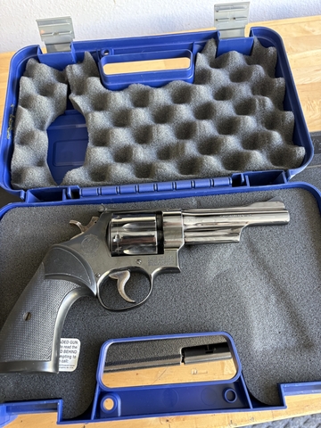 Condition: Excellent. Nickel finish is bright and consistent with no flaking or peeling. Timing and lock-up are solid. Aftermarket rubber grips included; original walnut stocks not available.