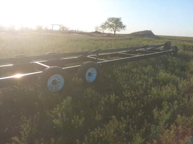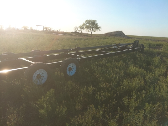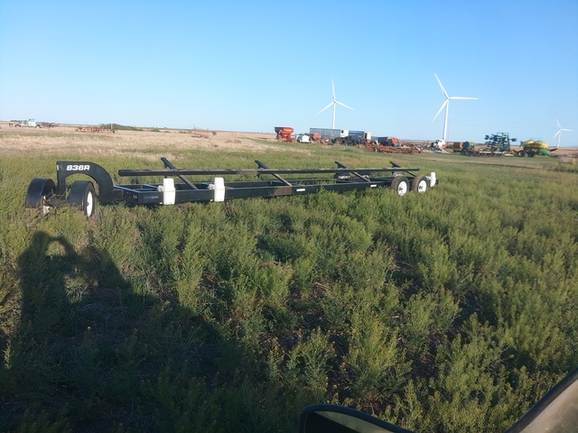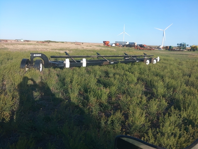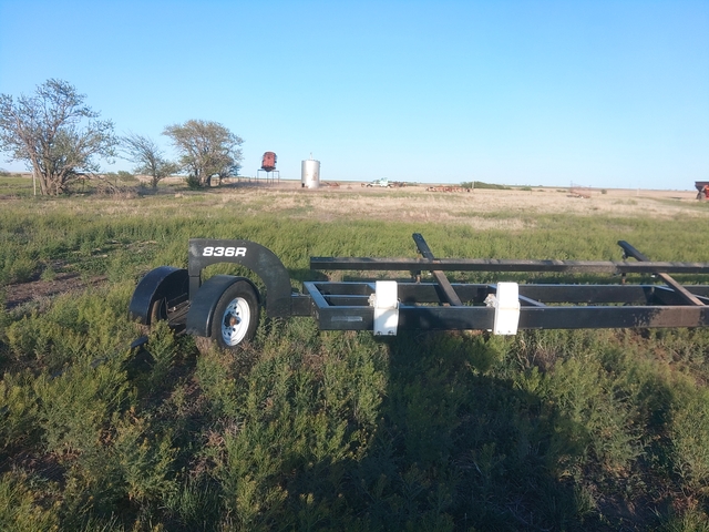 836R header trailer believe I bought this 5or 6 years ago lights and brakes on one axle tires are like new trailer doesn't have two thousand miles on it only used to haul header from field to field fully adjustable for different headers very well built trailer bought a Mac down header that came with a trailer so I don't need this one any more thanks this trailer can also remove the dolly and be pulled as a bumper pull 7000.00 obo.