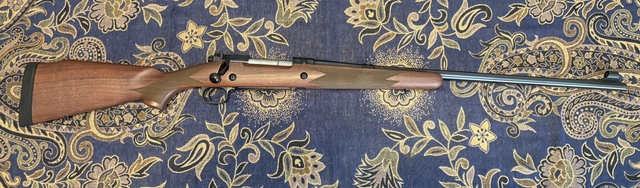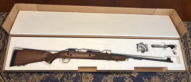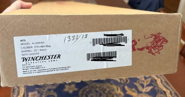 A like new in box Winchester Model 70 chambered in 375 H&H. This is an Alaskan model with sights and drilled for scope mounts. This has the controlled round feed and claw extractor like the pre-64 models. The stock is walnut with a classic oil finish. A beautiful rifle with nice little touches such as jeweled bolt and engraving on the cross bolts. Asking $1,250 or best offer. Please feel free to email me here or text me at 62O-48O-nine-two-seven-eight.