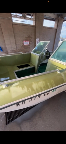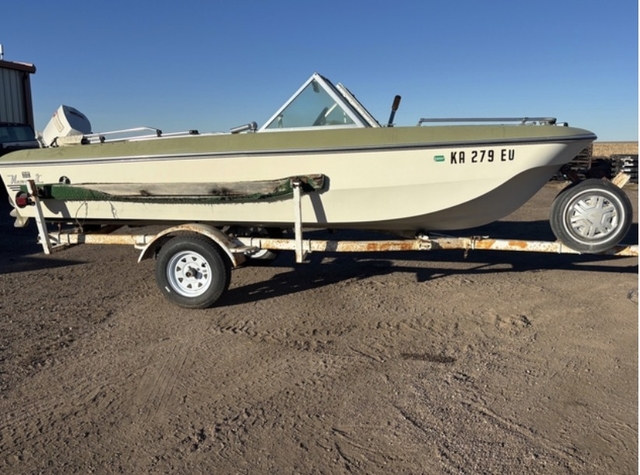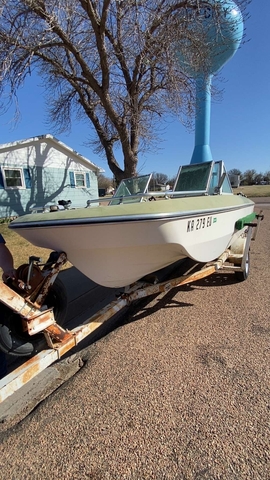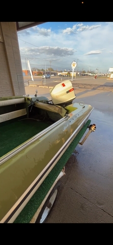 it has a 65 hp Johnson motor on it that isn't currently running. The hull has some skuffs but has no leaks. Comes with 2 gas tanks, a new battery, gel coat repair kit, a new ignition, new captain seats, motor oil and gear oil, and spark plugs. It's all cleaned out and would be a great project I just don't have time for it