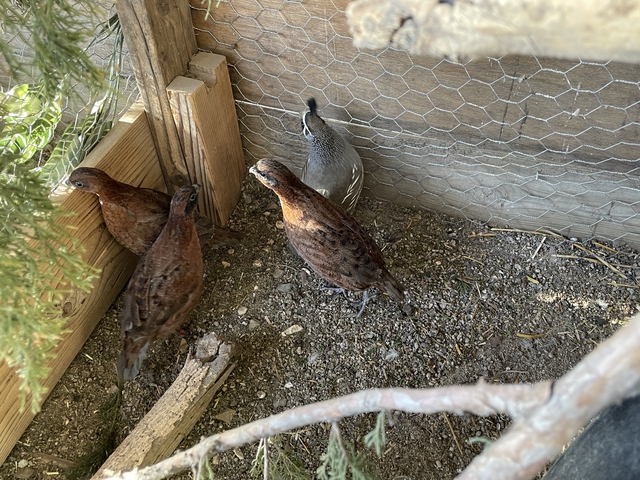 $20 One male California quail and $10 each Three Tennessee Red quail one female two males all hatched July 2025 and $20 two male Muscovy hatched July 2025 and $25 one gander hatched spring 2024
